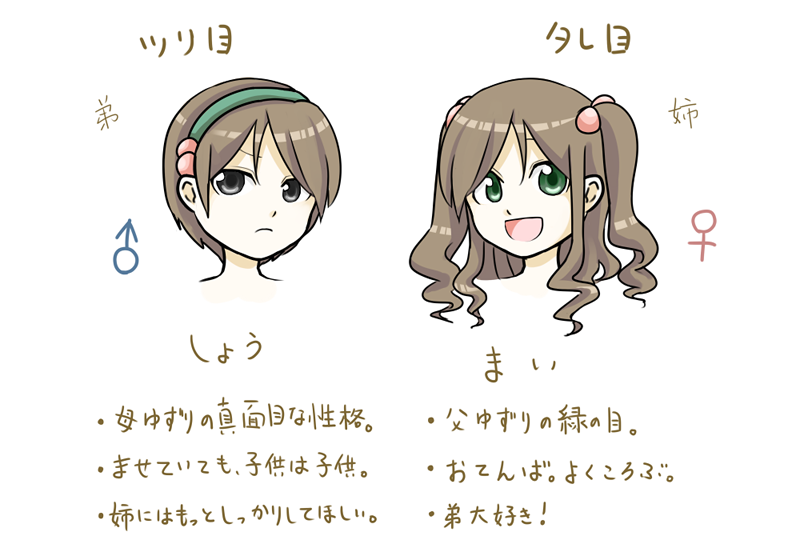 【女の子:茶色の髪に深緑の瞳・短めのツーサイドアップのウェーブ 男の子:茶色の髪に黒い瞳・ショート+カチューシャ】な双子の姉弟ができました!