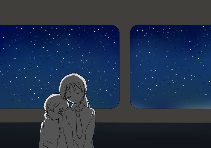 一面の星空だけが続く世界を走る丑刻電車の中で、二人寄り添って眠る瑞樹と七草です。